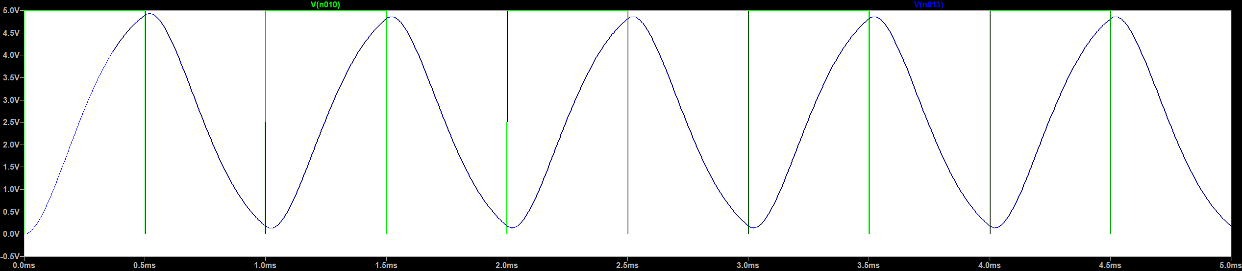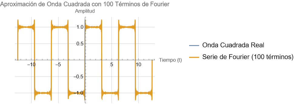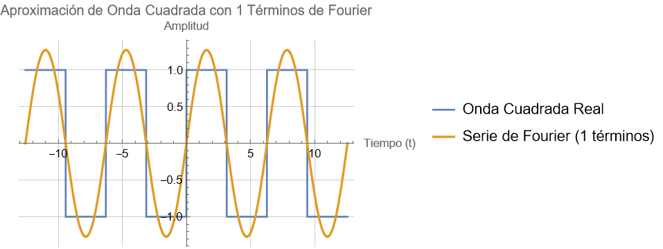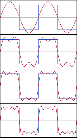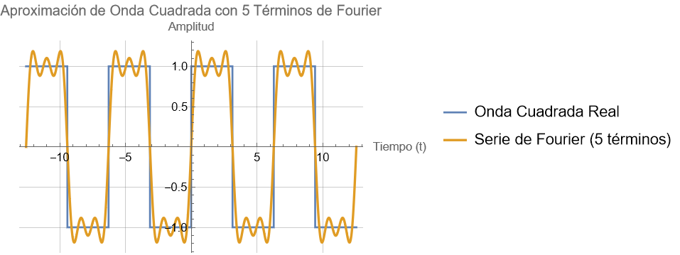 Una onda cuadrada periódica (y de hecho cualquier tipo de onda periódica), está formada por una serie de ondas senoidales y cosenoidales. De hecho, en la figura se puede apreciar cómo se va formando la onda cuadrada a partir de ondas senoidales y la primera de ellas, la fundamental, es nuestra onda senoidal.Examinando la serie de Fourier de una onda cuadrada vemos que está formada por los senos impares. Si realizamos la suma de los 5 primeros términos obtenemos la siguiente figura,