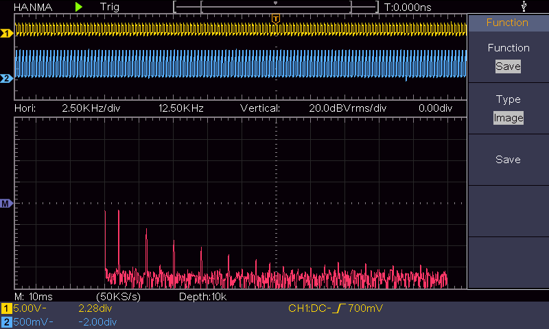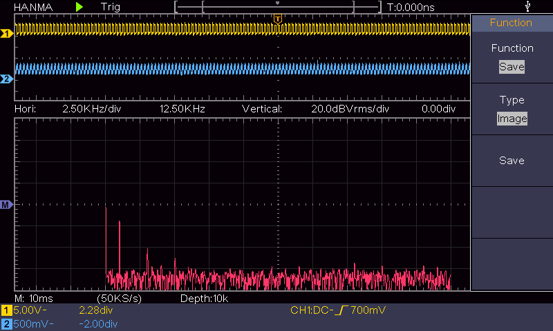 y la respuesta en la simulación era muy buena En este caso, aunque los valores reales del circuito también son una burda aproximación, el resultado es mucho mejor que los obtenidos con el filtro Butterworth anterior, aunque evidentemente se debe a que este filtro es de orden 3… Como vemos, el único armónico destacable es el tercero. La señal es mucho más limpia y de hecho en el osciloscopio la senoidal de 1kHz obtenida a partir de una onda cuadrada de también 1kHz, tiene una pinta muy buena.
