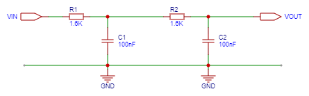 nos lleva a la siguiente configuración con la que obtenemos que como vemos es muy deficiente. La razón la podemos encontrar en la sección de la Wikipedia donde explica el comportamiento del filtro RC pasabajo donde podemos ver cómo estamos atenuando la señal en -6dB por octava (o -20dB por década), lo cual no es suficiente. Por tanto, vamos a incrementar el orden del filtro simplemente concatenando filtros de primer orden.Respuesta en frecuencias